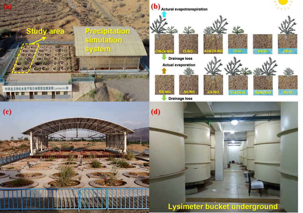 中國科學(xué)院西北生態(tài)環(huán)境資源研究院張志山研究員團(tuán)隊(duì),依托沙坡頭沙漠研究試驗(yàn)站的“中國北方沙區(qū)水量平衡自動模擬監(jiān)測系統(tǒng)——沙坡頭蒸滲儀(Lysimeter)群”,采用其中12個大型稱重式蒸滲儀(填充土壤為騰格里沙漠的風(fēng)沙土,從裸沙到多種單一栽植及灌木與半灌木混合栽植),系統(tǒng)量化了2019年至2023年間不同沙漠生態(tài)系統(tǒng)(有無地下水)的水量平衡組分及植物生長動態(tài)。