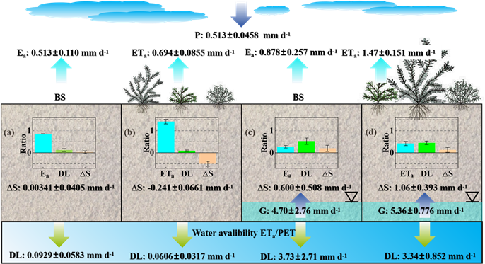 地下水與植物栽植對水量平衡各組分的影響。裸沙(a,c)和栽植植物的蒸滲儀(b,d)在無地下水條件(a,b)和有地下水條件(c,d)。Ea: 實(shí)際蒸發(fā)量;ETa: 實(shí)際蒸散發(fā)量;?S: 土壤水儲量變化;DL:滲漏量。