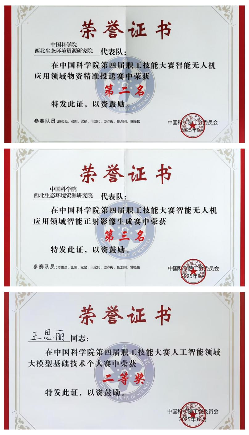 在西北研究院黨委的高度重視與工會的精心組織下,科研團(tuán)隊積極響應(yīng)、踴躍參賽。智能無人機(jī)應(yīng)用領(lǐng)域,由黑河遙感試驗研究站譚俊磊、亢健、張陽等6名選手組成的團(tuán)隊通過精準(zhǔn)路徑規(guī)劃與動態(tài)負(fù)載調(diào)控,實現(xiàn)復(fù)雜環(huán)境下物資的穩(wěn)定投送,依托自研靶標(biāo)識別程序,顯著提升正射影像數(shù)據(jù)處理效率,榮獲了“物資精準(zhǔn)投送”賽道全院第二名,“智能正射影像生成”賽道全院第三名和團(tuán)隊三等獎。在網(wǎng)信智能應(yīng)用服務(wù)領(lǐng)域,國家冰川凍土沙漠科學(xué)數(shù)據(jù)中心團(tuán)隊將專業(yè)領(lǐng)域數(shù)據(jù)和服務(wù)能力與AI的強(qiáng)大分析推理能力結(jié)合,實現(xiàn)自然語言交互、數(shù)據(jù)智能分析和可視化展示,提升了數(shù)據(jù)中心的智能化服務(wù)水平,榮獲了“MCP云服務(wù)”賽道三等獎。在人工智能領(lǐng)域,文獻(xiàn)情報中心王思麗基于中國科學(xué)院 “磐石?科學(xué)基礎(chǔ)大模型”,圍繞人工智能基礎(chǔ)理論、實操能力與知識融合推理能力展開角逐,榮獲“大模型基礎(chǔ)技術(shù)個人賽”二等獎。