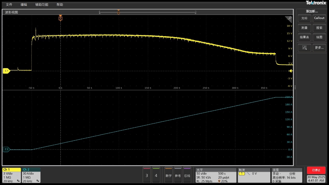 圖2 :額定電流210A勵磁時電流和電壓曲線