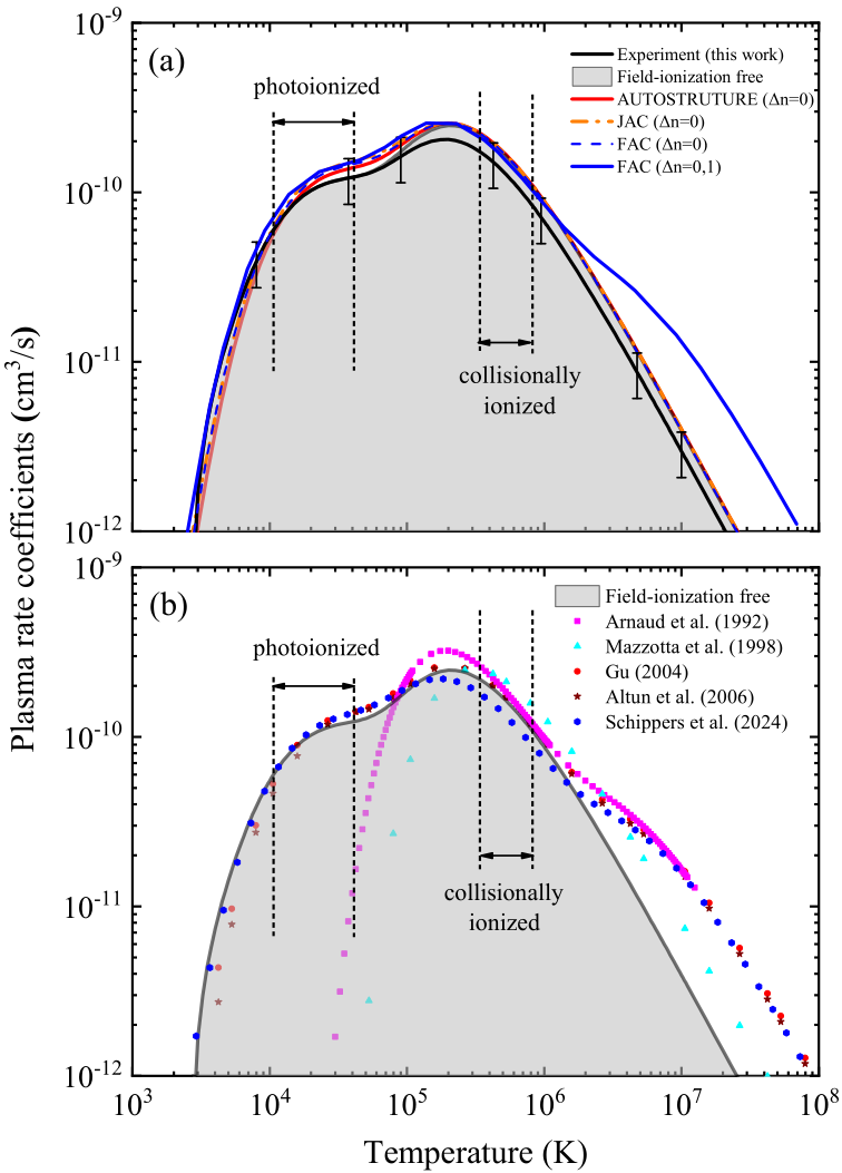 基于蘭州重離子加速器冷卻儲(chǔ)存環(huán)開展的高電荷態(tài)離子的雙電子復(fù)合精密譜學(xué)實(shí)驗(yàn)具有較高的能量分辨,且其電子-離子相對(duì)能量可大范圍精密調(diào)制,是目前唯一能夠精確測(cè)量低能碰撞復(fù)合截面關(guān)鍵數(shù)據(jù)的實(shí)驗(yàn)方法??蒲袌F(tuán)隊(duì)在對(duì)M殼層類鈉鐵離子 Fe15+的實(shí)驗(yàn)中,成功測(cè)量了 0-90 eV 能量范圍內(nèi)的復(fù)合速率系數(shù)。他們將實(shí)驗(yàn)結(jié)果與最新的理論Flexible Atomic Code (FAC) 、AUTOSTRUCTURE、Jena Atomic Calculator (JAC)計(jì)算的結(jié)果仔細(xì)對(duì)比,解析出每個(gè)共振結(jié)構(gòu)的來(lái)源。同時(shí),科研人員從雙電子復(fù)合速率系數(shù)得到了可用于等離子體建模的等離子體速率系數(shù),并與此前的理論數(shù)據(jù)作了對(duì)比研究。