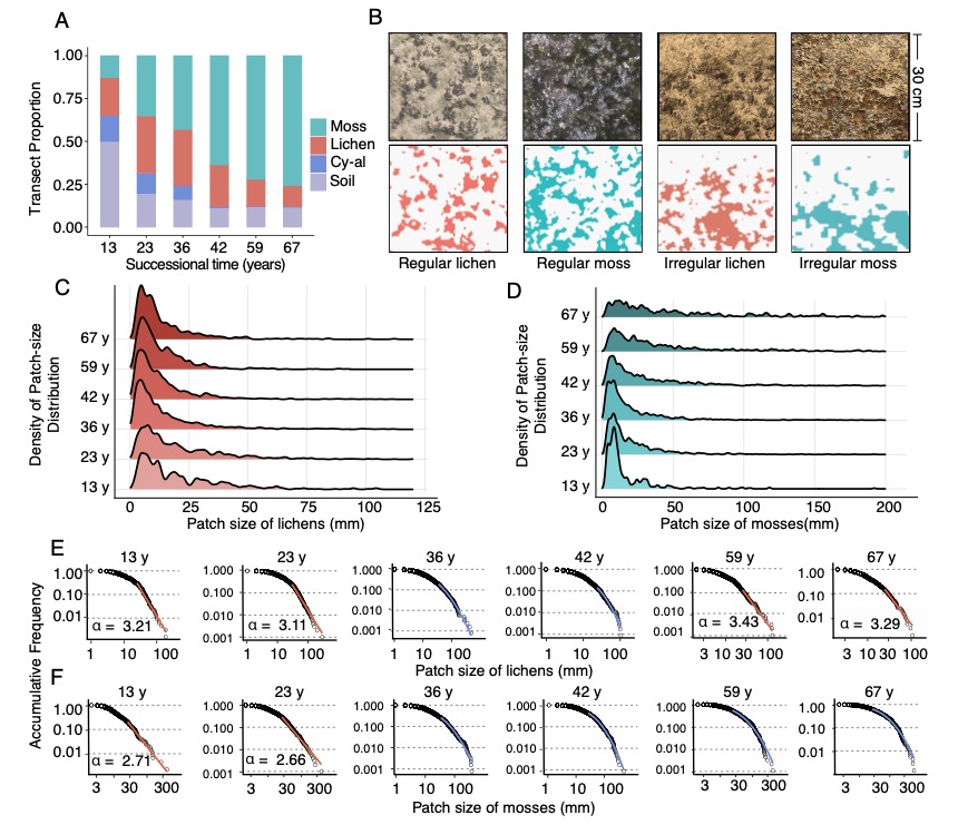 研究團隊采用了計算建模與全局-局部耦合的野外調查相結合的研究方法。理論建?;诟怕实脑詣訖C(Cellular automaton)模型的開發(fā),模擬了地衣和蘚類斑塊的動態(tài)變化。野外觀測在中國科學院沙坡頭沙漠試驗研究站進行,通過在不同演替階段的人工固沙植被帶中設置樣線,記錄了生物結皮的覆蓋度、組成和斑塊大小分布。研究通過對冪律分布的擬合,從全局尺度檢測主導生物結皮動態(tài)的反饋模式。通過不同演替階段和不同斑塊大小下生物結皮斑塊中心與邊緣之間的生長差異比較,從斑塊尺度驗證局部自組織過程,對比模擬結果揭示了生物結皮自組織機理及其生態(tài)意義。