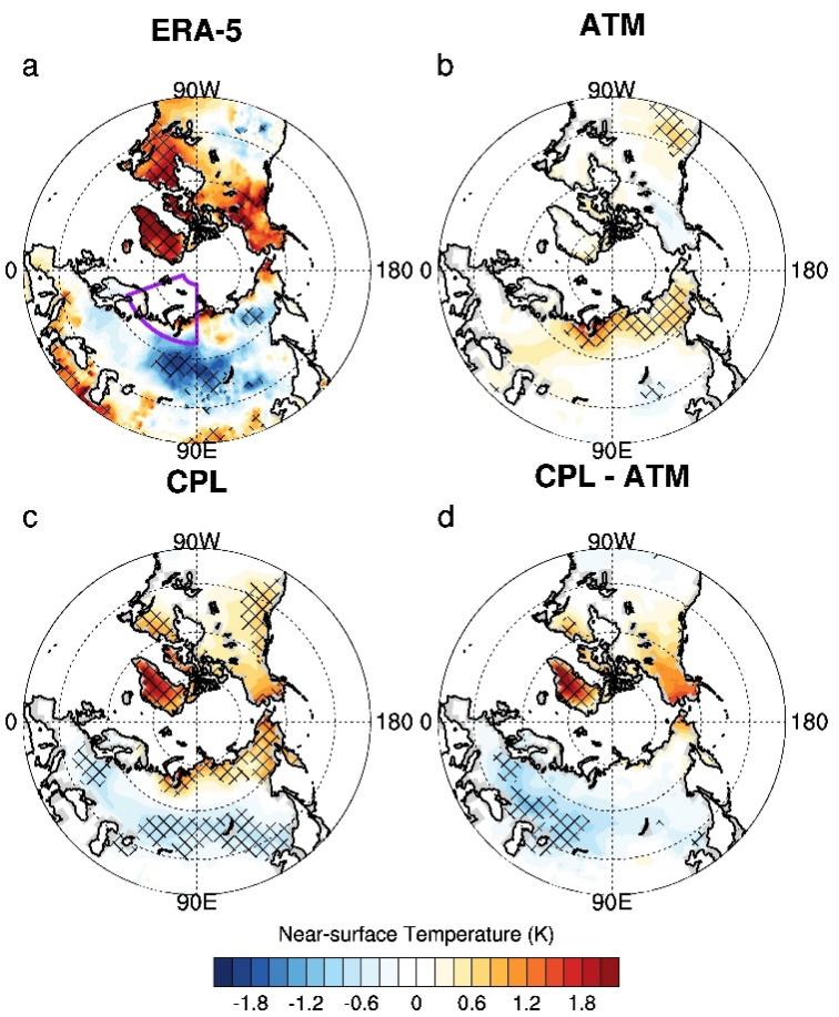 從ERA-5再分析資料(a)、僅考慮大氣過程的大氣模式試驗(b)及包含海-氣耦合過程的全耦合模式試驗(c)得到的歷史時期海冰消融導致的冬季地表氣溫異常(K)。(d)為全耦合模式試驗與大氣模式試驗結果之差