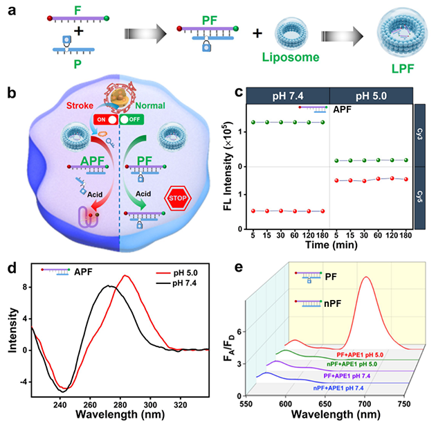 研究團(tuán)隊以酸性pH響應(yīng)的i-motif結(jié)構(gòu)F鏈為傳感核心,通過與含有APE1酶特異性識別位點的互補(bǔ)“阻斷鏈”P鏈雜交,構(gòu)建可激活型pH探針(PF)。進(jìn)一步經(jīng)脂質(zhì)體包封形成LPF,顯著提升了其血腦屏障穿透能力及在體穩(wěn)定性。該傳感器僅在APE1高表達(dá)的缺血病灶區(qū)被激活后,才能實現(xiàn)對缺血腦區(qū)pH的高對比度、高特異性比率型成像(圖1)。在腦卒中動物模型中,LPF成功實現(xiàn)了對腦內(nèi)pH梯度的動態(tài)、空間分辨監(jiān)測,清晰勾勒出缺血區(qū)域,展現(xiàn)出優(yōu)異的血腦屏障穿透能力與成像信噪比(圖2)。以上研究為腦卒中早期檢測、機(jī)制研究和新藥研究提供了新策略。