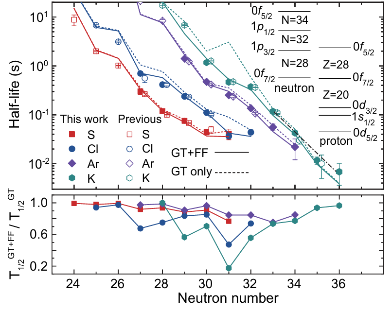 圖2:上圖:豐中子S、Cl、Ar和K同位素的β衰變半衰期系統(tǒng)性。實(shí)心符號(hào)表示本次實(shí)驗(yàn)的測量值,空心符號(hào)為文獻(xiàn)值。實(shí)線和虛線分別展示了同時(shí)包含GT和FF躍遷以及僅考慮GT躍遷的殼模型理論半衰期。黑色點(diǎn)劃線用以突出54K35半衰期的偏離系統(tǒng)性下降。相關(guān)的中子、質(zhì)子軌道顯示在了右上角。下圖:包含F(xiàn)F和GT躍遷的理論半衰期與僅考慮GT躍遷的理論半衰期之比