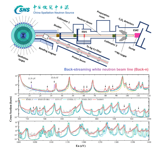 在中子俘獲反應(yīng)研究方面,研究團(tuán)隊(duì)基于中國散裂中子源反角白光中子束線(CSNS Back-n),利用高純度銠-103靶材開展了1eV-1MeV能區(qū)中子俘獲反應(yīng)截面的直接測量。實(shí)驗(yàn)結(jié)果表明,國際主要評價(jià)數(shù)據(jù)庫ENDF/B-VIII.1,JEFF-3.3和JENDL-5中11.9 eV和33.0 eV處標(biāo)注的共振能級并不存在。分析認(rèn)為,上述數(shù)據(jù)庫中的共振峰可能源于早期實(shí)驗(yàn)樣品中鉑族元素鈀(108Pd)與鉑(195Pt)雜質(zhì)的貢獻(xiàn)。此外,基于CSNS Back-n束流的高注量率和優(yōu)異的飛行時(shí)間分辨能力,本次實(shí)驗(yàn)首次發(fā)現(xiàn)了銠-103的8個(gè)新共振峰,并利用R-矩陣程序SAMMY提取了相應(yīng)的共振參數(shù)。