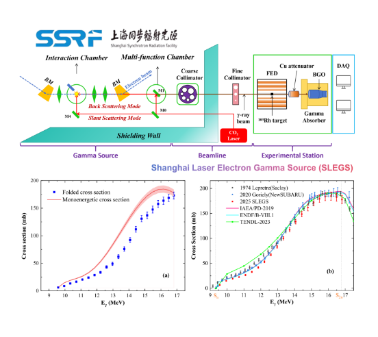 圖2 :SSRF SLEGS線站光核反應(yīng)實(shí)驗(yàn)布局、103Rh(γ,n)反應(yīng)實(shí)驗(yàn)截面值與評價(jià)庫的比較
