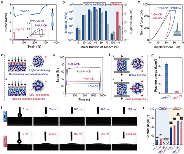 圖3. (a) 不同水凝膠的單軸拉伸應(yīng)力-應(yīng)變曲線。(b) 楊氏模量和韌性與MAAm含量的關(guān)系。(c) 表面納米壓痕測(cè)試曲線。(d) 抗蠕變性能測(cè)試示意圖及(e)蠕變曲線。(f) 純剪切測(cè)試示意圖及(g)斷裂能結(jié)果。(h) 水滴在BiGel-CB和IsoGel-CB表面的動(dòng)態(tài)鋪展過(guò)程。(i)?超親水及水下超疏油性能評(píng)估。