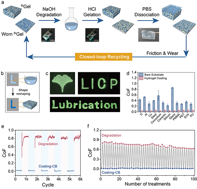 圖6.(a) 魯棒潤(rùn)滑系統(tǒng)的閉環(huán)回收示意圖。(b) 形狀重塑過(guò)程示意圖。(c) 制造的不同形狀水凝膠圖案(銀杏葉、研究所徽章“LICP”、文字“Lubrication”)。(d) 水凝膠涂層與相應(yīng)裸基底摩擦系數(shù)的對(duì)比。(e) 降解-重建循環(huán)過(guò)程中的摩擦系數(shù)曲線及(f)平均摩擦系數(shù)值對(duì)比(以玻璃為基底,“處理次數(shù)”以奇數(shù)次代表涂層、偶數(shù)次代表降解來(lái)表征)。