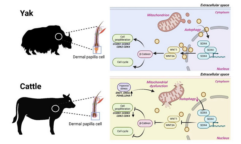 研究團(tuán)隊(duì)進(jìn)一步利用ATAC-seq與ChIP-qPCR發(fā)現(xiàn)了轉(zhuǎn)錄因子SOX4可直接結(jié)合WNT1與WNT3A基因的啟動(dòng)子區(qū)域,且這一結(jié)合對基因的轉(zhuǎn)錄激活作用通過雙熒光素酶實(shí)驗(yàn)得到驗(yàn)證。SOX4的表達(dá)受自噬水平調(diào)控,激活自噬可挽救SOX4抑制劑對DP細(xì)胞增殖的抑制作用。該調(diào)控通路在牦牛體中表現(xiàn)出更強(qiáng)的信號(hào)活性,通過促進(jìn)DP細(xì)胞周期進(jìn)程、增強(qiáng)細(xì)胞增殖能力來維持毛囊穩(wěn)態(tài);同時(shí),該通路還能改善線粒體結(jié)構(gòu)完整性以抵御氧化應(yīng)激,從而可能促進(jìn)毛囊生長,系統(tǒng)性增強(qiáng)牦牛對高原寒冷環(huán)境的生存適應(yīng)能力??傊?,研究團(tuán)隊(duì)從單細(xì)胞水平解析了牦牛毛囊適應(yīng)高原寒冷環(huán)境的分子特征,為理解動(dòng)物對高原極端環(huán)境的適應(yīng)機(jī)制提供了重要基礎(chǔ)數(shù)據(jù)。