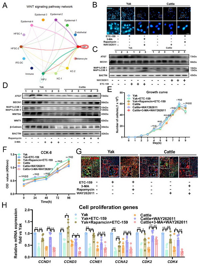 文章代表圖:DP細(xì)胞中自噬與增殖的相互作用由WNT/β-Catenin通路介導(dǎo)。(A)DP細(xì)胞單細(xì)胞數(shù)據(jù)中WNT信號(hào)通路的細(xì)胞相互作用圖。(B)不同處理后牦牛和普通牛DP細(xì)胞的MDA活細(xì)胞染色。(C)牦牛、牦牛+ETC-159、普通牛和普通牛+WAY262611處理組DP細(xì)胞中ATG7、BECN1和LC3I/II的蛋白質(zhì)印跡分析(n=3)。(D) 牦牛、牦牛+3-MA、普通牛和普通牛+雷帕霉素處理組DP 細(xì)胞中ATG7、BECN1、LC3I/II、WNT3A、WNT1和β-Catenin的蛋白質(zhì)印跡分析(n=3)。(E-F)牦牛、牦牛+ETC-159、牦牛+雷帕霉素+ETC-159、普通牛、普通牛+WAY262611和普通牛+3-MA+WAY262611組DP細(xì)胞的生長曲線(n=9)和CCK-8檢測結(jié)果(n=4)。(G)不同處理組牦牛和普通牛DP細(xì)胞體外培養(yǎng)后PCNA和MKi67的代表性免疫熒光圖像(n=8)。(H)實(shí)時(shí)熒光定量PCR檢測細(xì)胞增殖相關(guān)基因CCND1、CCND3、CCNE1、CCNA2、CDK2和CDK4的mRNA表達(dá)情況(n=6)