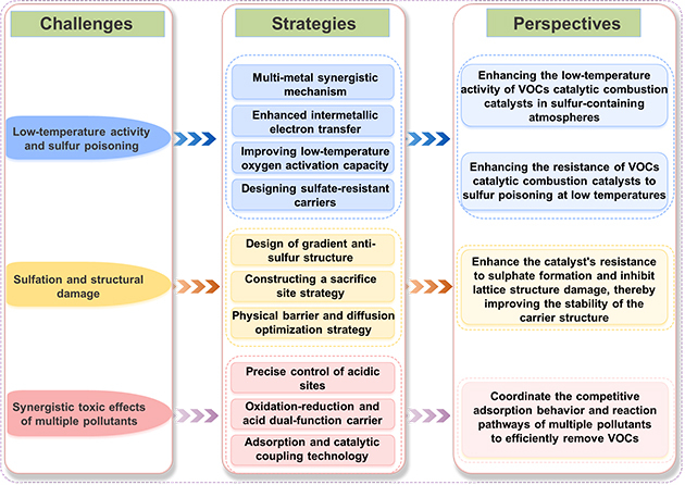 圖2. VOCs催化燃燒抗硫催化劑面臨的挑戰(zhàn)、當(dāng)前應(yīng)對(duì)策略及該領(lǐng)域發(fā)展前景