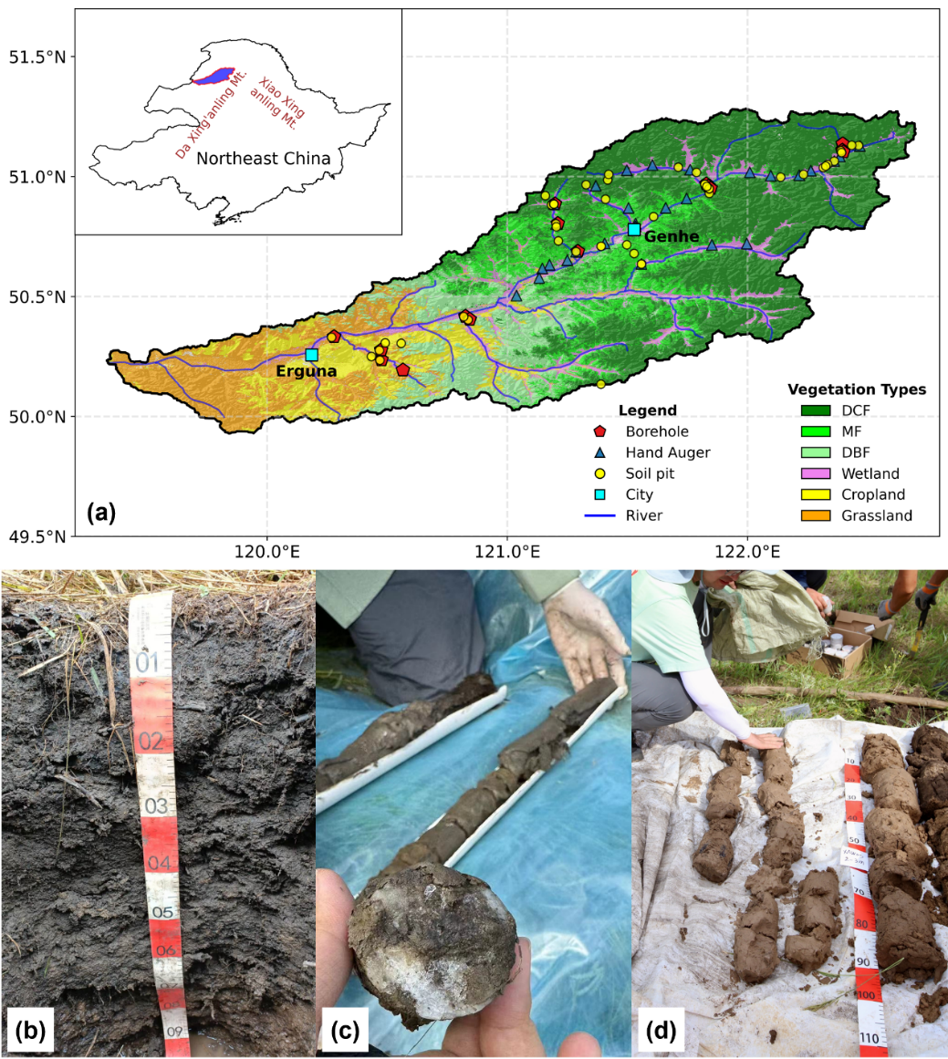 研究團隊在根河流域布設(shè)75個淺層土壤剖面和15個深達20米的鉆孔,獲取了覆蓋森林、草地、濕地等不同下墊面的土壤含水量觀測數(shù)據(jù)。并結(jié)合可解釋機器學(xué)習(xí)與結(jié)構(gòu)方程模型,系統(tǒng)揭示了邊緣多年凍土區(qū)土壤水分的“垂向分層”特征及其控制機制。