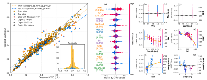 該數(shù)據(jù)產(chǎn)品表現(xiàn)優(yōu)異(R2 = 0.85, RMSE = 0.08 L/L),能精準(zhǔn)刻畫凍土與濕地共同塑造的“河谷濕潤走廊”及干燥高地的空間分異,彌補了SMAP等全球粗分辨率產(chǎn)品難以解析深層與亞公里尺度異質(zhì)性的不足,為寒區(qū)流域水文模擬與生態(tài)管理提供了可移植的制圖方案與高精度基礎(chǔ)數(shù)據(jù)。
