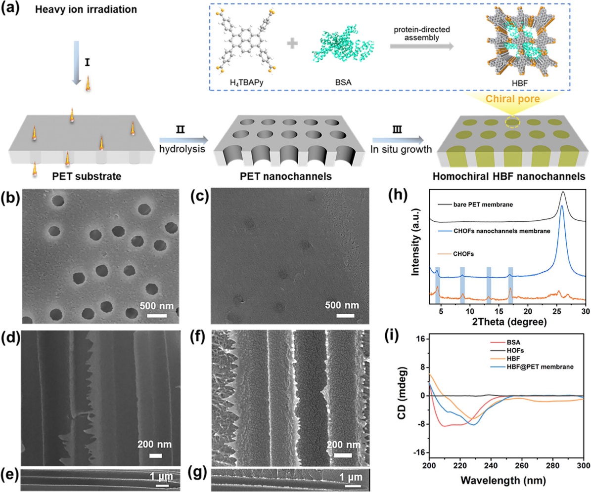 近日,中國(guó)科學(xué)院近代物理研究所重離子科學(xué)與技術(shù)全國(guó)重點(diǎn)實(shí)驗(yàn)室材料研究中心與蘭州大學(xué)化學(xué)化工學(xué)院、東江實(shí)驗(yàn)室合作,在手性分離膜研究方面取得重要進(jìn)展。研究團(tuán)隊(duì)依托蘭州重離子加速器(HIRFL)提供的重離子輻照技術(shù),成功制備出一種具有同手性特征的氫鍵生物雜化框架核孔膜(HBF@PET),實(shí)現(xiàn)了對(duì)氨基酸對(duì)映體的高效、精準(zhǔn)分離。相關(guān)成果于近日發(fā)表在國(guó)際化學(xué)期刊《美國(guó)化學(xué)會(huì)志》(Journal of the American Chemical Society)上。