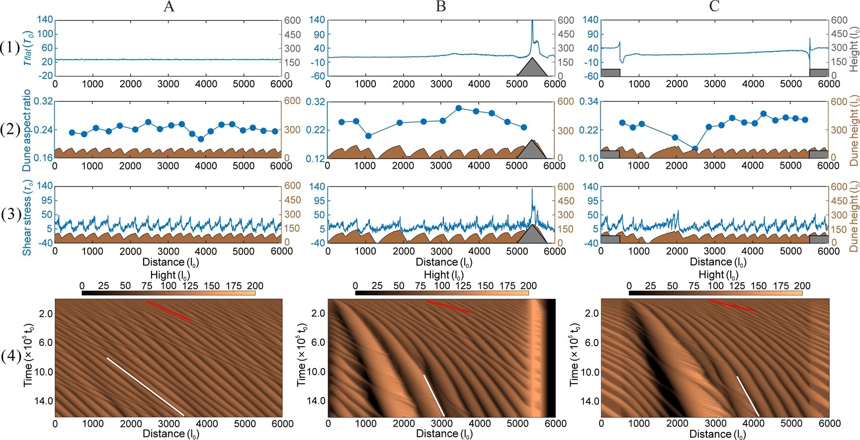 數(shù)值模擬結果揭示了沙山發(fā)育的核心機制:平坦地形下沙物質均勻分配,抑制高大沙山發(fā)育;山體、盆地等正負地形引發(fā)剪切應力突變,增強沙通量匯聚與沙丘碰撞融合,加速沙丘“粗化”長高。地形通過持續(xù)塑造風場與沙源空間異質性,成為高大沙山形成的關鍵動力。