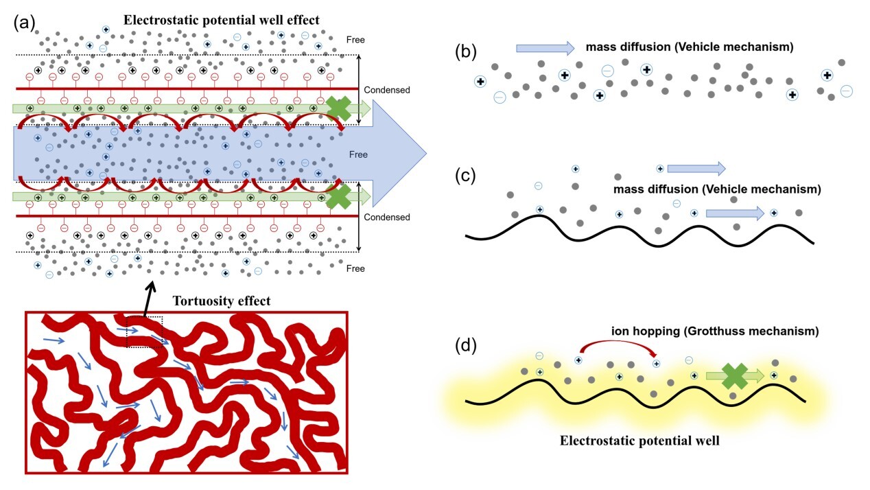 圖1. 迂曲的高電荷密度納米離子傳輸通道內(nèi)的“反離子異常傳輸增強”機制示意圖及其與其它離子傳輸機制(純水溶液和之前認為的膜內(nèi)離子傳輸機制)的差異