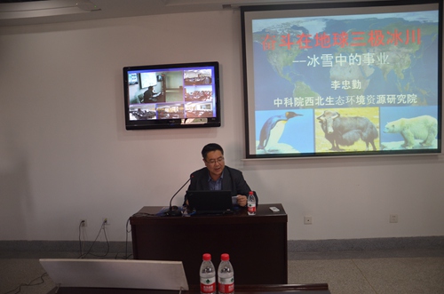 李忠勤結合自己在高寒極端環(huán)境無私奉獻30年的難忘工作經(jīng)歷,為與會人員深情講述了他《奮斗在地球三極冰川》的感人故事。他的報告分“北極科學考察介紹”、“走進南極”和“中國冰川定位觀測”三個部分,通過普及地球三極(南極、北極和青藏高原)知識、梳理回顧世界及中國冰川科考歷史、介紹中國冰川科考站情況及科考隊感人事跡,為大家作了一場生動、感人的報告,一幅幅珍貴難得的實地照片再現(xiàn)了冰川科考工作的極端艱辛,一句句深情感人的樸實語言展示了共產黨人無私奉獻的政治品格。同時,他強調指出,他所在的科研團隊結合冰凍圈科學研究以野外工作為基礎,具有人員分散、工作辛苦等特點的實際,制定了以黨小組為單元,研究室支部、所黨委聯(lián)動的“兩學一做”方案,以科研工作為載體和抓手,深入扎實推進“兩學一做”學習教育,取得了良好效果,發(fā)揮了黨支部是戰(zhàn)斗堡壘作用。他的報告圖文并茂,真實感人,既是一場科普報告,更是一場生動黨課,受到與會人員歡迎和好評。